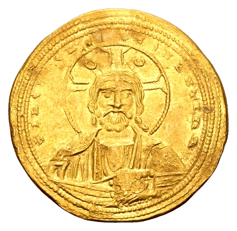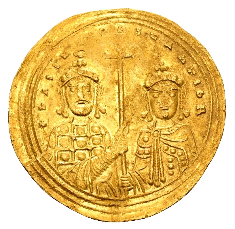 Rev.: + bASIL Є COhStAhtIh R; crowned facing busts of Basil II, bearded, wearing loros of large jeweled pattern, crowned from above by manus Dei, on the left and Constantine VIII, beardless, wearing jeweled chlamys pinned at right shoulder, on the right, jointly holding long cross between them; triple border.