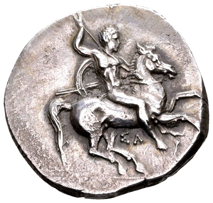 Obv.: ephebe on horse galloping to the right, stabbing downwards with spear held in his right hand and holding two other spears and shield in his left; below: ΣA.