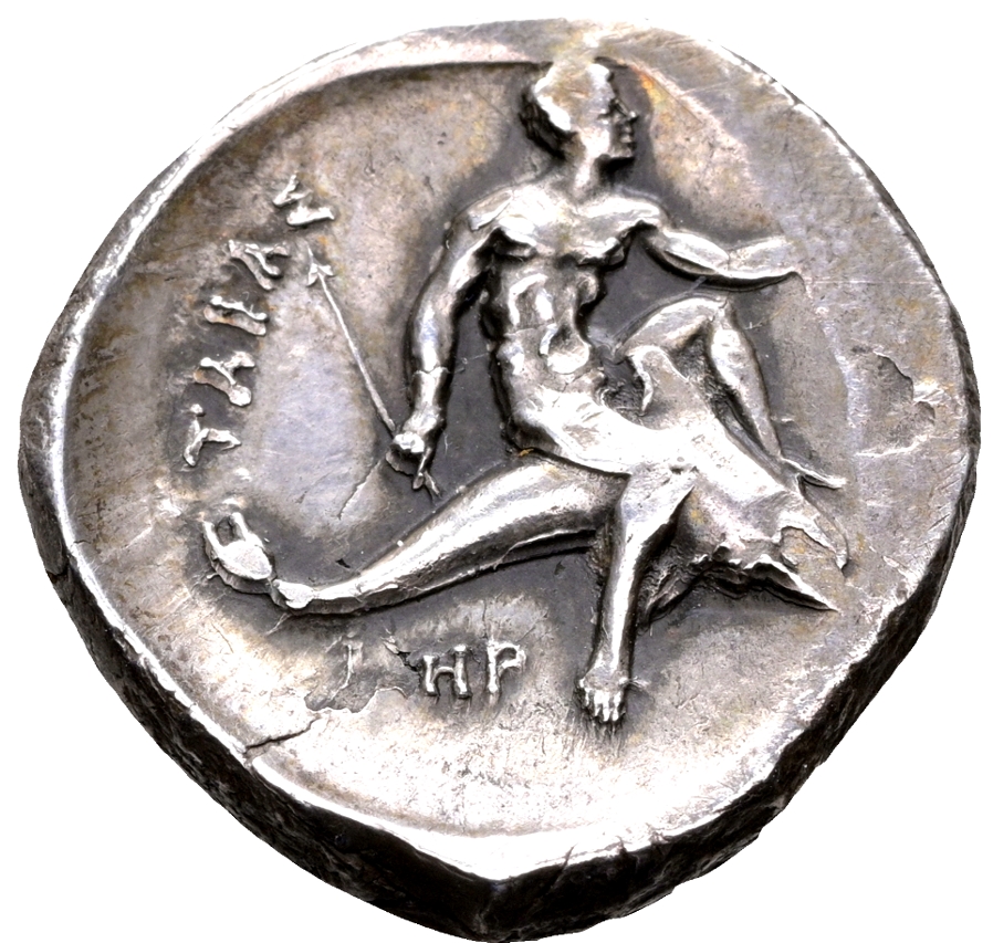 Rev. ΤΑΡΑΣ; youthful oikist, nude, riding dolphin swimming to the right, holding arrow in his right hand and bow in his left; below: ՒHP-monogram.