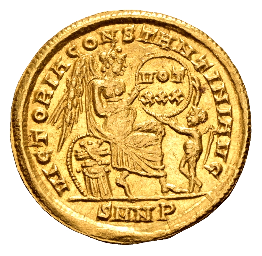 Rev.: VICTORIA CONSTANTINI AUG; Victory, winged and draped, seated to the right on cuirass, inscribing shield with VOT XXX in two lines using stylus in right hand; before her, infant Genius, winged and standing to the left, supporting shield with both hands; in exergue: SMNP.