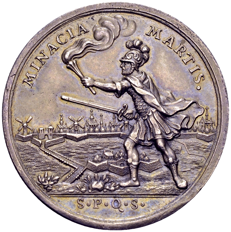 Obv: MINACIA MARTIS; Mars on the right, with sword and torch in his hands, moving on city behind: landscape with southside of the city and the st. Antonie-rampart; in exergue: S•P•Q•S•.