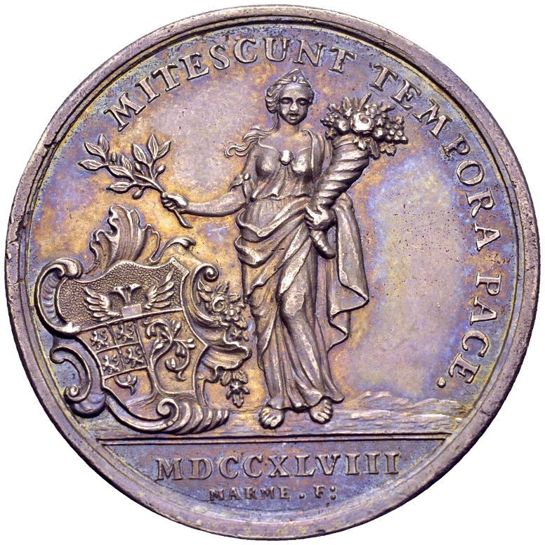 Rev: MITESCUNT TEMPORA PACE•; Pax standing facing with olive branch and cornucopiae, shield with city’s coat of arms at her feet to the left; in exergue: MDCCXLVIII MARME.F in two lines.